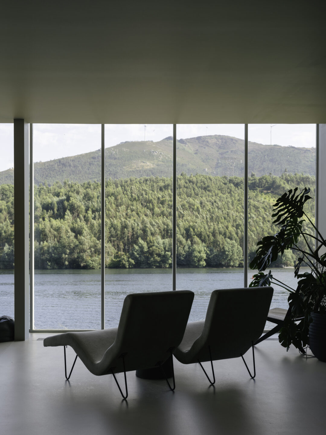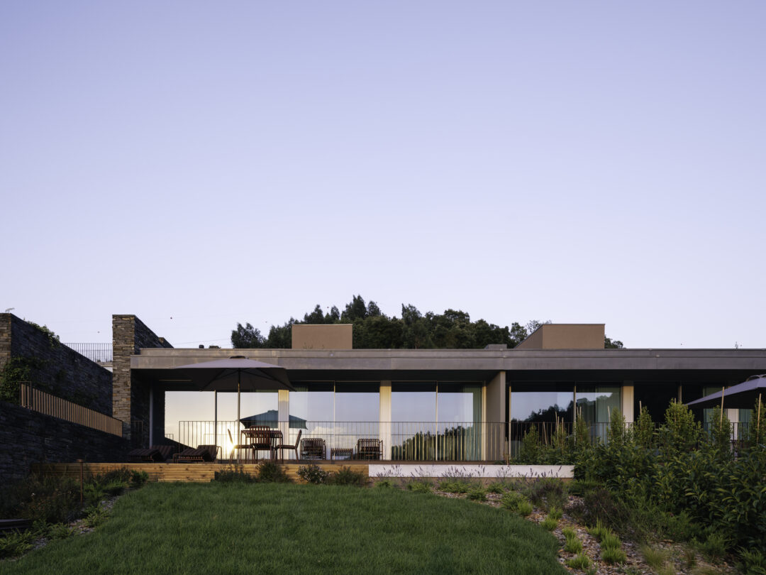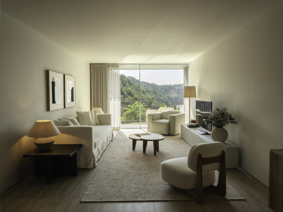 Light, space, and nature define the first impression. Floor-to-ceiling windows open onto the river, turning every room into a private viewing deck over the ever-changing landscape — morning mist drifting between hills, terraced vineyards cascading down the slopes, water stretching into the distance. The minimalist interiors keep the focus exactly where it belongs: on the valley itself.