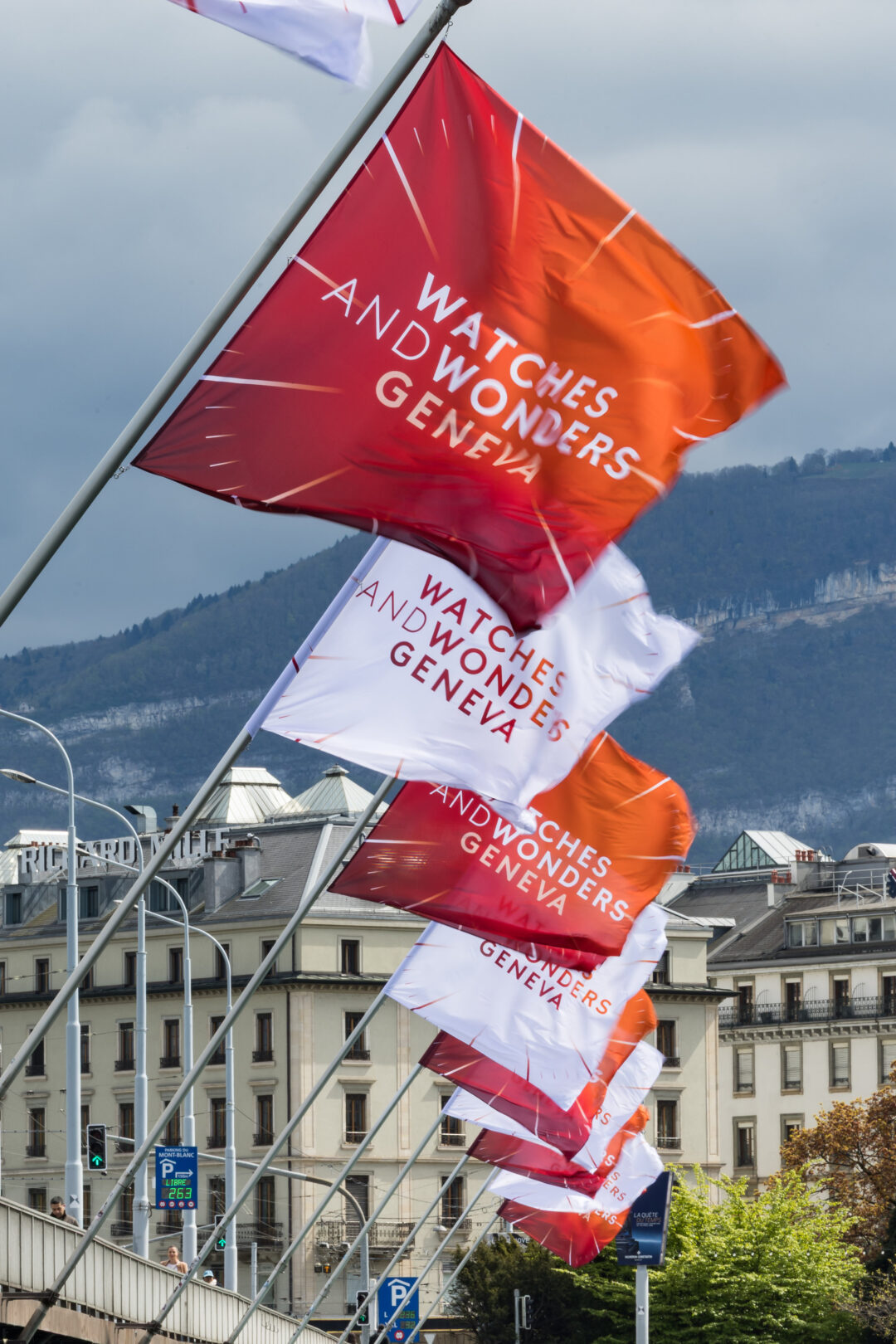 Branded flags during the Watches and Wonders GENEVA « In the City », in Geneva, Switzerland, Day 1, April 14, 2026. The largest watchmaking event of the year bringing together the leading names of the industry from April 14 to April 20, 2026 at Geneva Palexpo. (WWGF/KEYSTONE/Pierre Albouy)